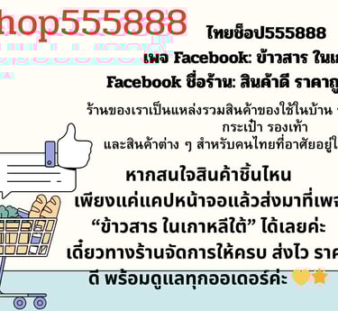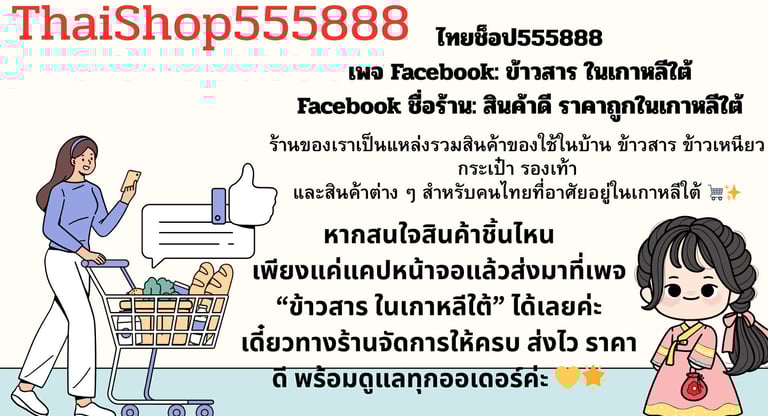 ไทยช็อป555888เพจ Facebook: ข้าวสาร ในเกาหลีใต้Facebook ชื่อร้าน: สินค้าดี ราคาถูกในเกาหลีใต้